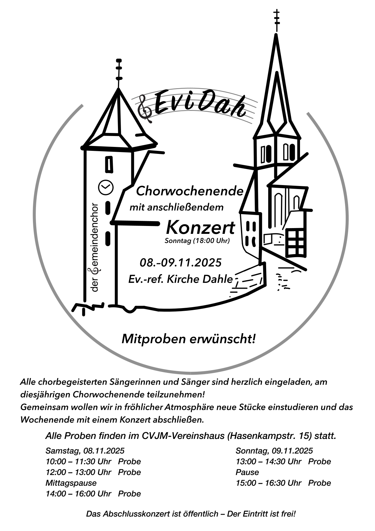 Unter Leitung von Herbert Frank und Siegfried Kaemper treffen sich die Sängerinnen und Sänger in Evingsen (Kirchsaal) oder Dahle (Kirchenanbau) zum Proben.